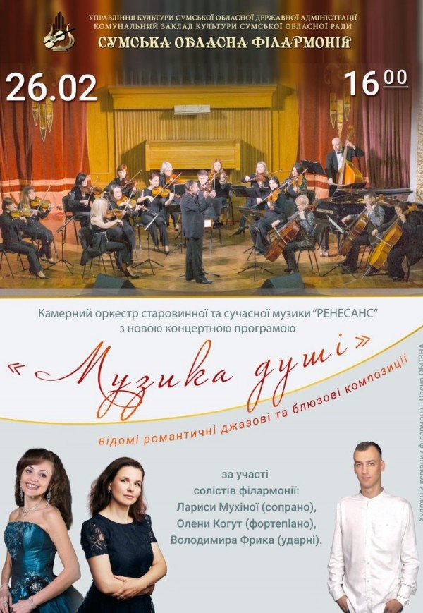 Концерт "Музыка души" состоится 26 февраля 2023, 16:00, воскресенье в Сумская областная филармония. С помощью сервиса internet-bilet.ua, Вы сможете с легкостью забронировать, заказать и купить билеты на интересующий Вас концерт, спектакль, оперу, балет, мастер-классы, спортивные и детские мероприятия, оплатив их самым удобным для Вас способом: через интернет банковской картой VISA/MasterCard, наличными или курьером, если сделаете заказ билета c доставкой.