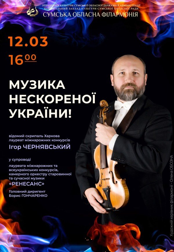 Музыка непокоренной Украины состоится 12 марта 2023, 16:00, воскресенье в Сумская областная филармония. С помощью сервиса internet-bilet.ua, Вы сможете с легкостью забронировать, заказать и купить билеты на интересующий Вас концерт, спектакль, оперу, балет, мастер-классы, спортивные и детские мероприятия, оплатив их самым удобным для Вас способом: через интернет банковской картой VISA/MasterCard, наличными или курьером, если сделаете заказ билета c доставкой.