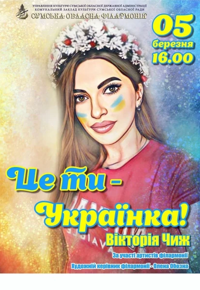 "Это ты – Украинка!". Виктория Чиж состоится 5 марта 2023, 16:00, воскресенье в Сумская областная филармония. С помощью сервиса internet-bilet.ua, Вы сможете с легкостью забронировать, заказать и купить билеты на интересующий Вас концерт, спектакль, оперу, балет, мастер-классы, спортивные и детские мероприятия, оплатив их самым удобным для Вас способом: через интернет банковской картой VISA/MasterCard, наличными или курьером, если сделаете заказ билета c доставкой.