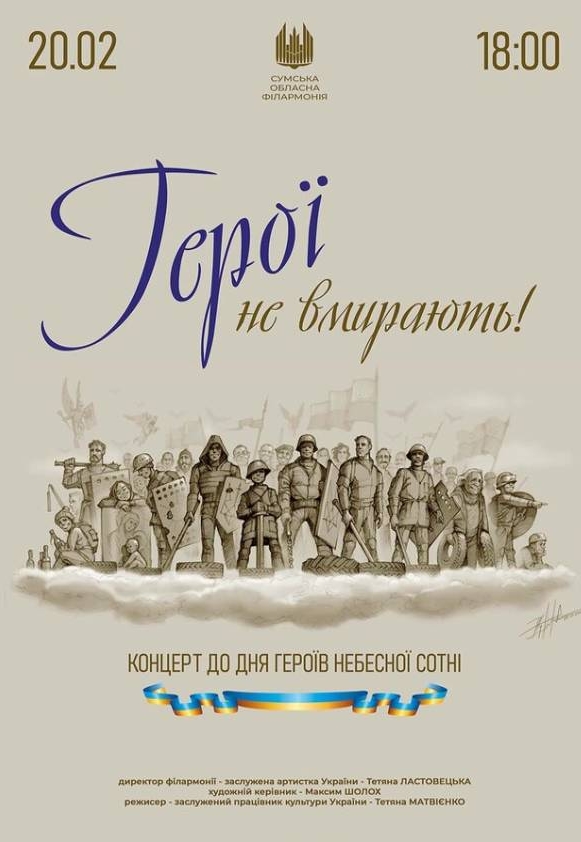 Герои не умирают (концерт) состоится 20 февраля 2026, 18:00, пятница в Сумская областная филармония. С помощью сервиса internet-bilet.ua, Вы сможете с легкостью забронировать, заказать и купить билеты на интересующий Вас концерт, спектакль, оперу, балет, мастер-классы, спортивные и детские мероприятия, оплатив их самым удобным для Вас способом: через интернет банковской картой VISA/MasterCard, наличными или курьером, если сделаете заказ билета c доставкой.