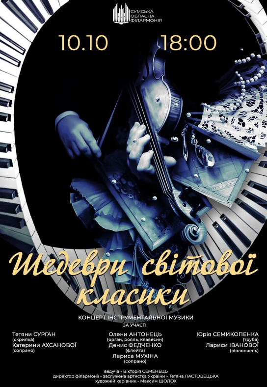 Концерт «Шедевры мировой классики» состоится 10 октября 2025, 18:00, пятница в Сумская областная филармония. С помощью сервиса internet-bilet.ua, Вы сможете с легкостью забронировать, заказать и купить билеты на интересующий Вас концерт, спектакль, оперу, балет, мастер-классы, спортивные и детские мероприятия, оплатив их самым удобным для Вас способом: через интернет банковской картой VISA/MasterCard, наличными или курьером, если сделаете заказ билета c доставкой.