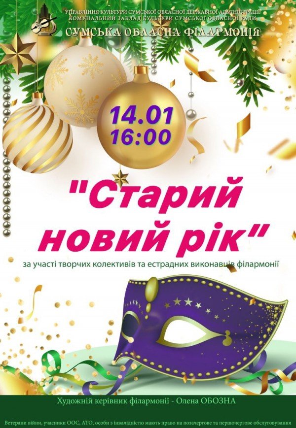 Концерт "Старий новий рік" відбудеться 14 січня 2023, 16:00, субота в Сумська обласна філармонія. За допомогою сервісу internet-bilet.ua, Ви зможете з легкістю забронювати, замовити та купити квитки на концерт, спектакль, оперу, балет, майстер-класи, спортивні та дитячі заходи, що Вас цікавлять, оплативши їх найбільш зручним для Вас способом: через інтернет банківською карткою VISA/MasterCard, готівкою або кур'єром, якщо зробите замовлення квитка з доставкою.