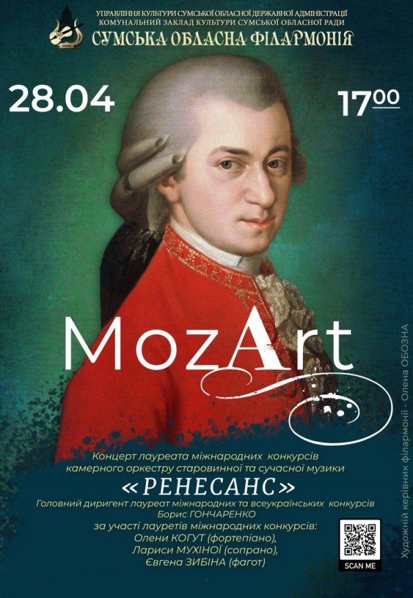 Концерт "MozArt" відбудеться 28 квітня 2023, 17:00, п’ятниця в Сумська обласна філармонія. За допомогою сервісу internet-bilet.ua, Ви зможете з легкістю забронювати, замовити та купити квитки на концерт, спектакль, оперу, балет, майстер-класи, спортивні та дитячі заходи, що Вас цікавлять, оплативши їх найбільш зручним для Вас способом: через інтернет банківською карткою VISA/MasterCard, готівкою або кур'єром, якщо зробите замовлення квитка з доставкою.