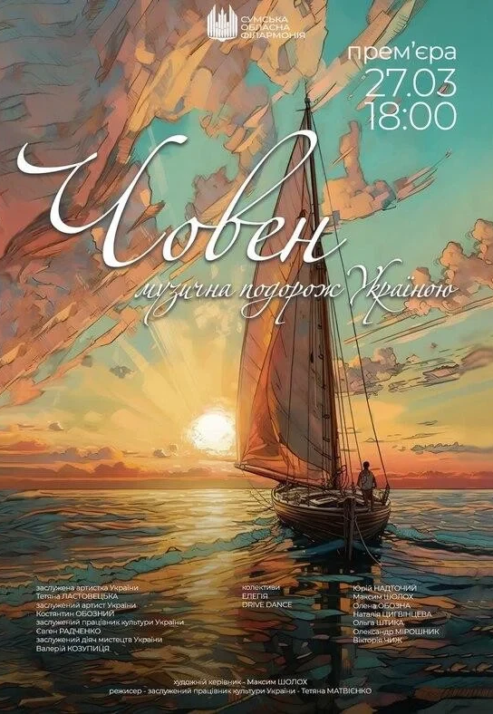 Концерт "Човен" відбудеться 27 березня 2025, 18:00, четвер в Сумська обласна філармонія. За допомогою сервісу internet-bilet.ua, Ви зможете з легкістю забронювати, замовити та купити квитки на концерт, спектакль, оперу, балет, майстер-класи, спортивні та дитячі заходи, що Вас цікавлять, оплативши їх найбільш зручним для Вас способом: через інтернет банківською карткою VISA/MasterCard, готівкою або кур'єром, якщо зробите замовлення квитка з доставкою.