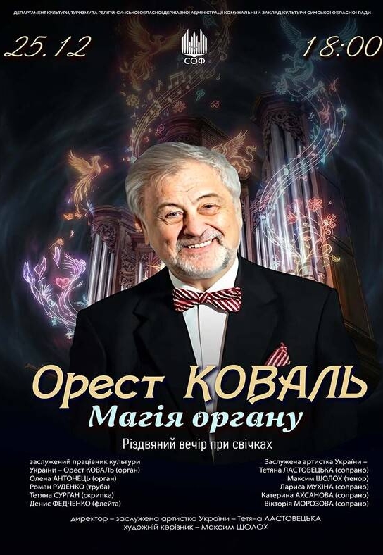 Орест Коваль. Магія органу відбудеться 25 грудня 2025, 18:00, четвер в Сумська обласна філармонія. За допомогою сервісу internet-bilet.ua, Ви зможете з легкістю забронювати, замовити та купити квитки на концерт, спектакль, оперу, балет, майстер-класи, спортивні та дитячі заходи, що Вас цікавлять, оплативши їх найбільш зручним для Вас способом: через інтернет банківською карткою VISA/MasterCard, готівкою або кур'єром, якщо зробите замовлення квитка з доставкою.