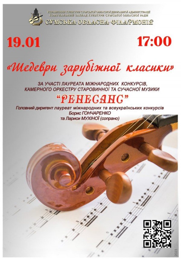 Концерт "Шедеври зарубіжної класики" відбудеться 19 січня 2024, 17:00, п’ятниця в Сумська обласна філармонія. За допомогою сервісу internet-bilet.ua, Ви зможете з легкістю забронювати, замовити та купити квитки на концерт, спектакль, оперу, балет, майстер-класи, спортивні та дитячі заходи, що Вас цікавлять, оплативши їх найбільш зручним для Вас способом: через інтернет банківською карткою VISA/MasterCard, готівкою або кур'єром, якщо зробите замовлення квитка з доставкою.