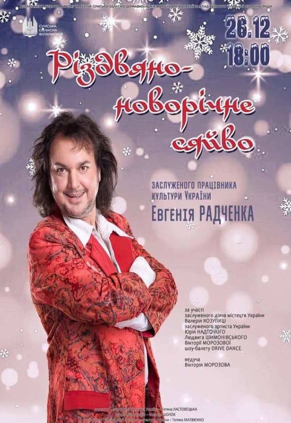 Різдвяно-новорічне сяйво Євгенія Радченка відбудеться 26 грудня 2025, 18:00, п’ятниця в Сумська обласна філармонія. За допомогою сервісу internet-bilet.ua, Ви зможете з легкістю забронювати, замовити та купити квитки на концерт, спектакль, оперу, балет, майстер-класи, спортивні та дитячі заходи, що Вас цікавлять, оплативши їх найбільш зручним для Вас способом: через інтернет банківською карткою VISA/MasterCard, готівкою або кур'єром, якщо зробите замовлення квитка з доставкою.
